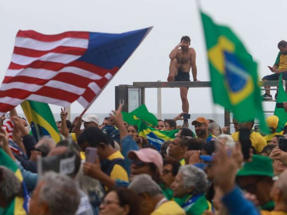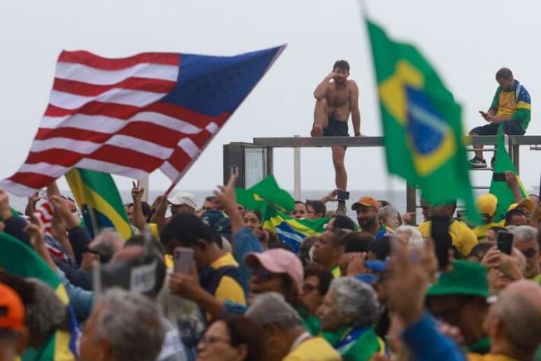 Ato bolsonarista em Copacabana tem bandeiras dos EUA e faixas contra o STF