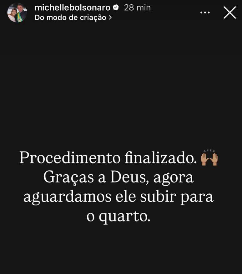 “Procedimento finalizado. Graças a deus, agora aguardamos ele subir para o quarto”, escreveu a ex-primeira-dama, em seu perfil no Instagram.