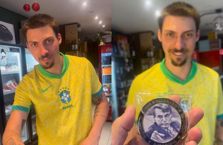 Após receber o acessório, o açougueiro garante apoiar o ex-presidente “sempre”. Na legenda da publicação, ele diz que é um “privilégio” receber a medalha das mãos do filho de Bolsonaro.