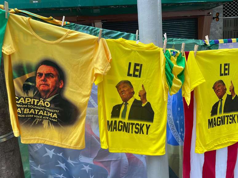 Os apoiadores do ex-presidente Jair Bolsonaro (PL) tinham um adereço preferido no ato em Copacabana, no Rio, neste domingo, 7 de setembro: a camisa com a imagem de Donald Trump e estampa escrita “Lei Magnitski” era exibida com orgulho pelos manisfestantes. A lei foi aplicada contra o ministro do Supremo Tribunal Federal (STF) Alexandre de Moraes por causa do processo contra o ex-presidente.