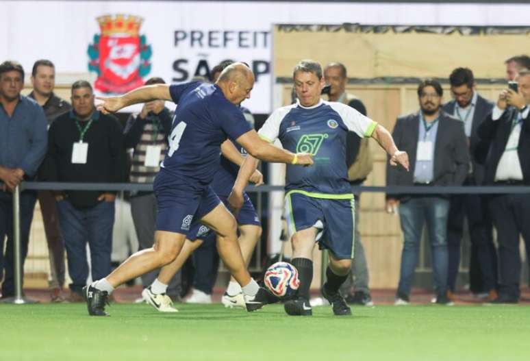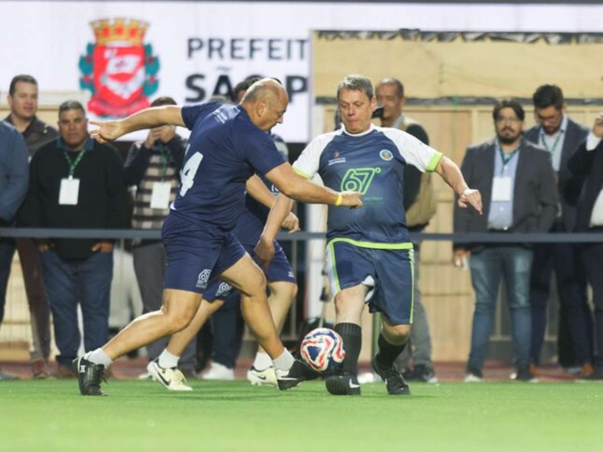 Com pênalti marcado por Kassab e passe de Cafu, Tarcísio faz gol e vence jogo com prefeitos; veja
