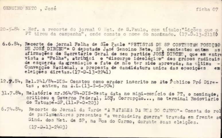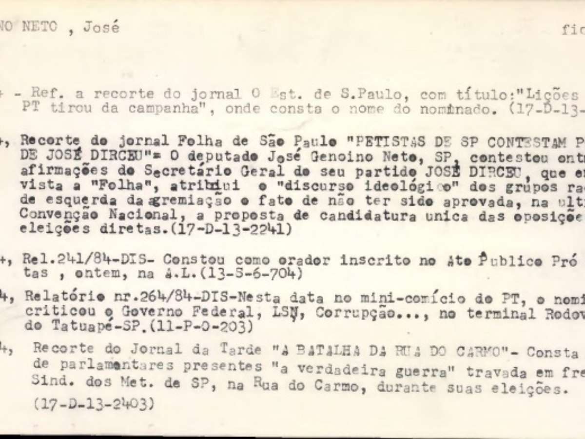 "O deputado José Genoino Neto, SP, contestou as afirmações do Secretário Geral do seu partido, José Dirceu, que em entrevista à Folha atribui ao 'discurso ideológico' dos grupos radicais de esquerda da agremiação o fato de não ter sido aprovada, na última Convenção Nacional, a proposta de candidatura única das oposições em eleições diretas", afirmou o documento, citando uma reportagem do jornal Folha de S. Paulo. Um mês depois, Dirceu voltou a ser investigado pela participação em um ato público na Assembleia de São Paulo em favor das eleições diretas.