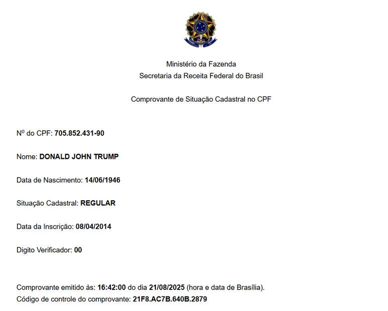 O presidente dos Estados Unidos, Donald Trump, possui um número de Cadastro de Pessoa Física (CPF) regular na Receita Federal desde abril de 2014. O documento confirma o nome completo — Donald John Trump — e a data de nascimento, 14 de junho de 1946, sem qualquer inconsistência em relação aos registros oficiais.