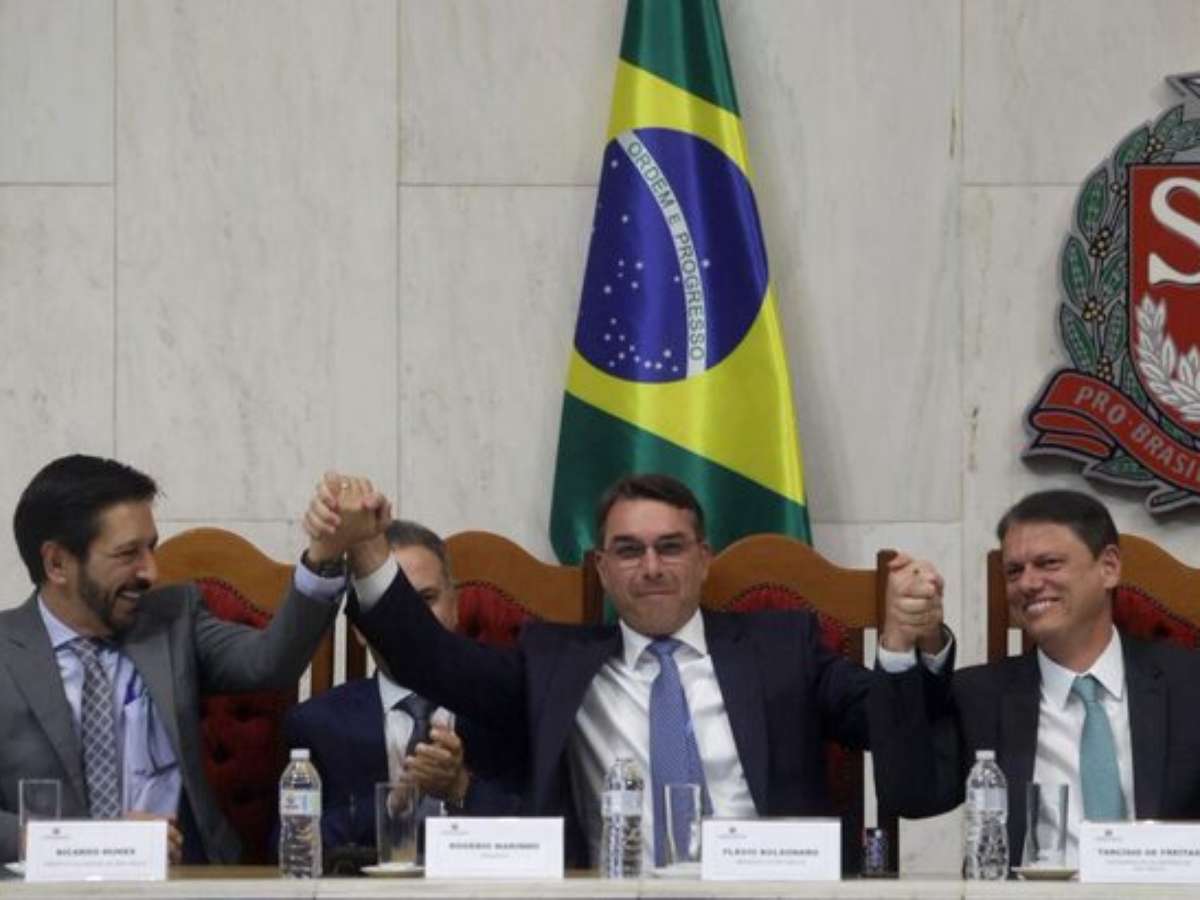 ??Em ato na Alesp, Tarcísio chama Flávio de 'futuro presidente' e reforça aproximação para 2026