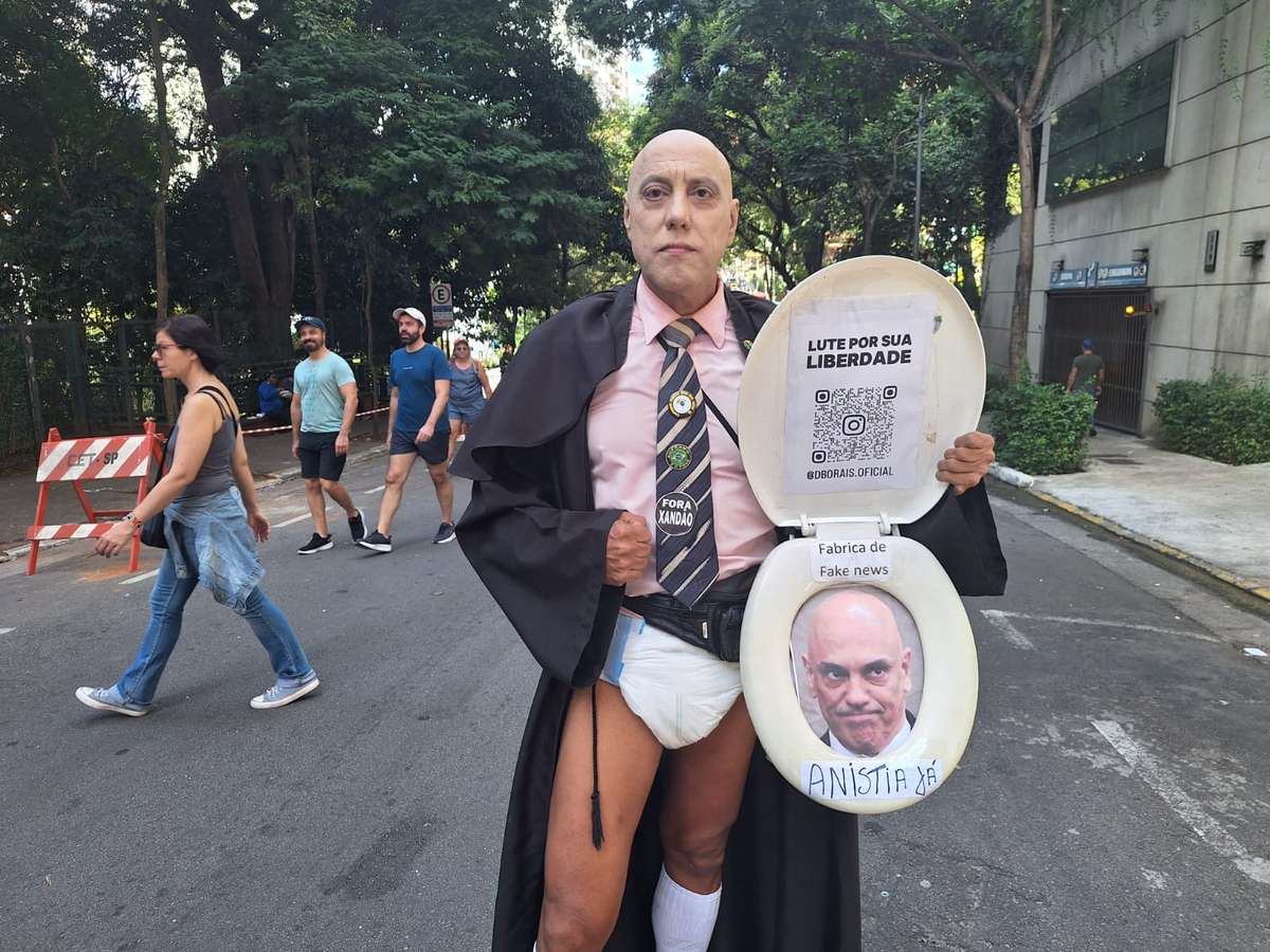 Em ato pró-Bolsonaro na Avenida Paulista, um manifestante fantasiado de Alexandre de Moraes criticou o STF, chamando-o de "suprema tribo", e utilizou elementos como uma fralda e uma tampa de vaso sanitário com o rosto de Lula para simbolizar sua insatisfação.