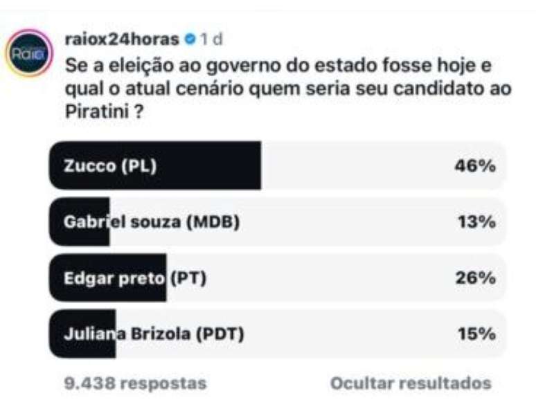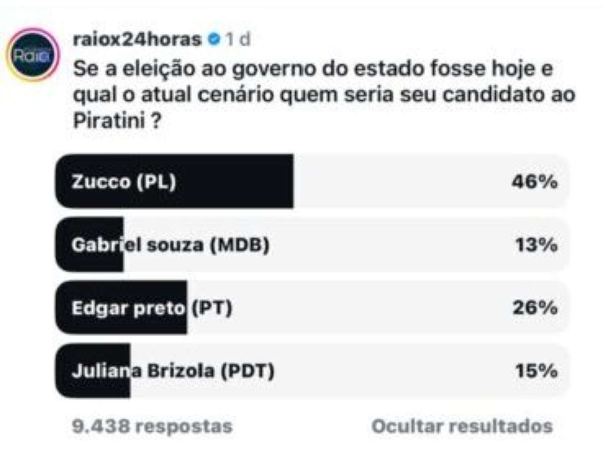 Uma enquete realizada pelo portal Porto Alegre 24 Horas na página oficial do Instagram apontou que, com os pré-candidatos atuais ao governo estadual no pleito do ano que vem, o deputado federal Luciano Zucco (PL) e o ex-parlamentar Edegar Pretto (PT) iriam disputar um segundo turno. O primeiro aparece com 46% das intenções de voto, enquanto o segundo dispõe de 26% dos eleitores que votaram na pesquisa.