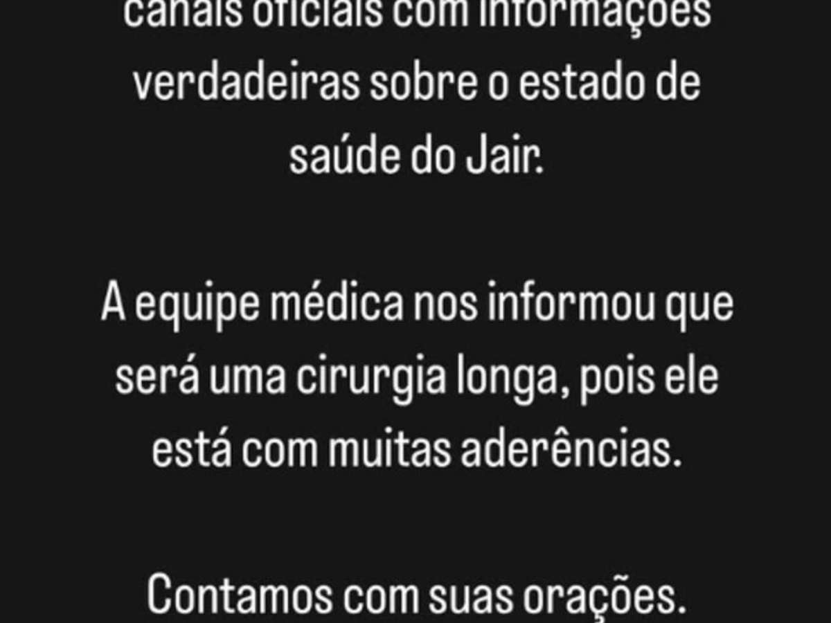 A ex-primeira-dama Michelle Bolsonaro usou suas redes sociais na tarde deste domingo, 13, para avisar que a cirurgia do marido, o ex-presidente Jair Bolsonaro (PL), pode demorar mais do que o esperado. "A equipe médica nos informou que será uma cirurgia longa, porque ele está com muitas aderências", informou, em postagem nos stories de seu Instagram.