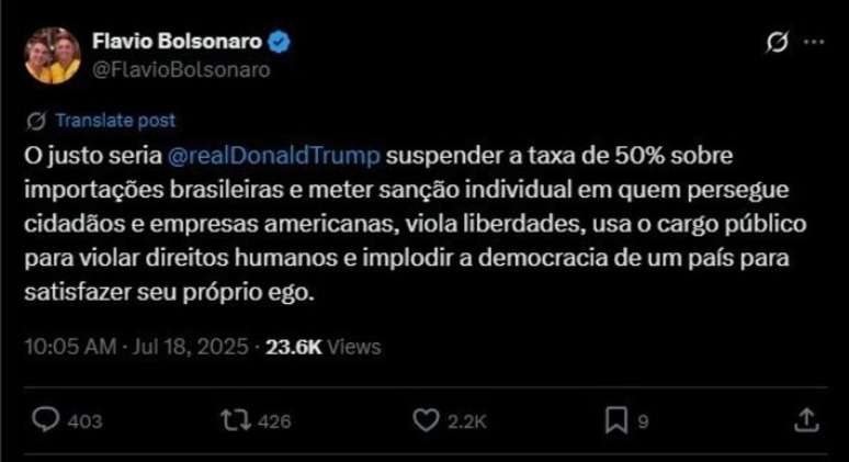 "O justo seria @realDonaldTrump suspender a taxa de 50% sobre importações brasileiras e meter sanção individual em quem persegue cidadãos e empresas americanas, viola liberdades, usa o cargo público para violar direitos humanos e implodir a democracia de um país para satisfazer seu próprio ego", afirmou o senador no último dia 18. Flávio apagou a publicação em seguida.