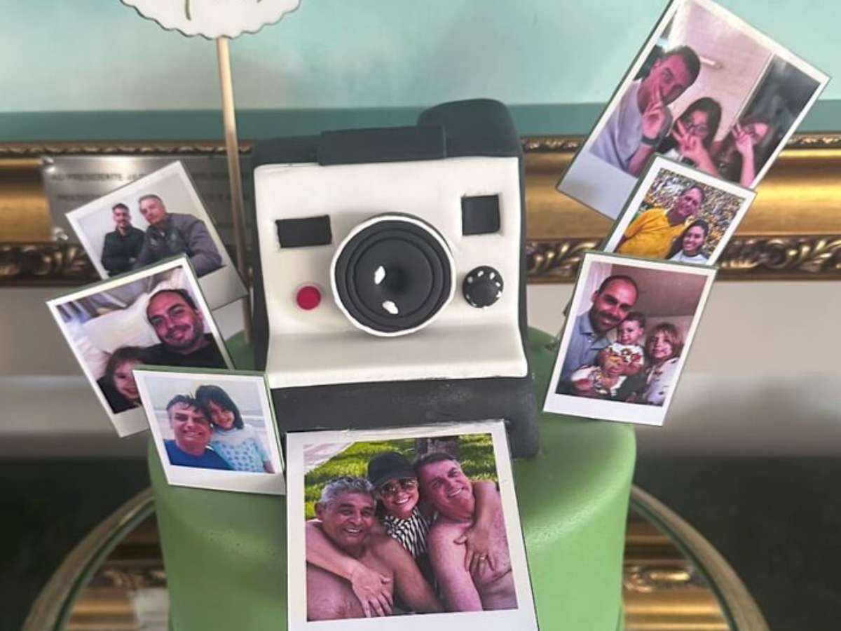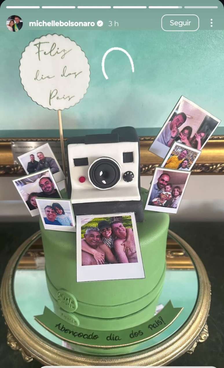 Michelle publicou no story de sua conta no Instagram foto de uma mesa com um bolo decorado com foto de Bolsonaro ao lado dos filhos, e os dizeres "Abençoado Dia dos Pais".