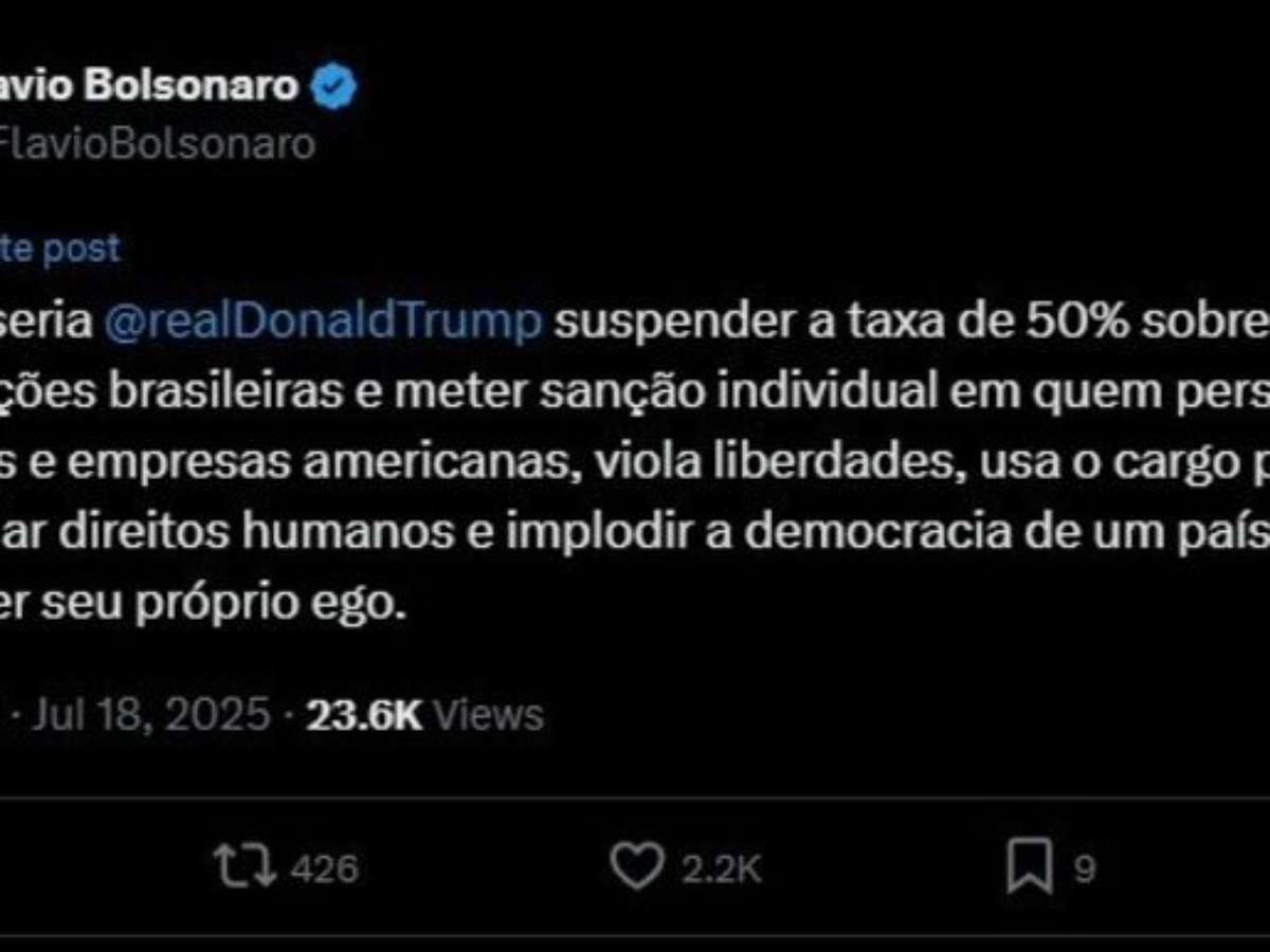 O senador Flávio Bolsonaro (PL-RJ) sugeriu na rede social X (antigo Twitter) que "o justo" seria que o presidentes dos Estados Unidos, Donald Trump, suspendesse a tarifa de 50% sobre as importações de produtos do Brasil e, em vez disso, aplicasse sanções individuais a quem supostamente pratica perseguições para interesses próprios.