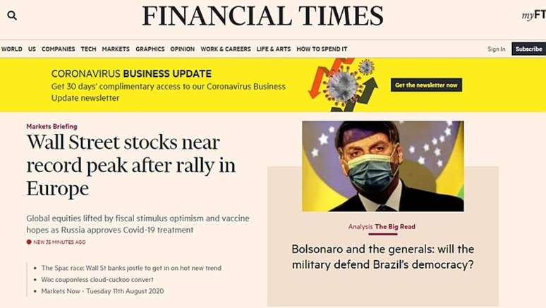 Está no alto do site do jornal britânico Financial Times, abaixo de uma foto do presidente brasileiro usando máscara: "Bolsonaro e os generais: os militares vão defender a democracia no Brasil?". A pergunta é o título de uma reportagem que está em destaque no "The Big Read", uma seção da publicação que se aprofunda sobre um tema por meio de um texto bastante extenso. Na versão impressa desta terça-feira, foi reproduzida uma versão menor da entrevista concedida pelo ex-ministro da Saúde Luiz Henrique Mandetta e que havia sido publicada ontem online.