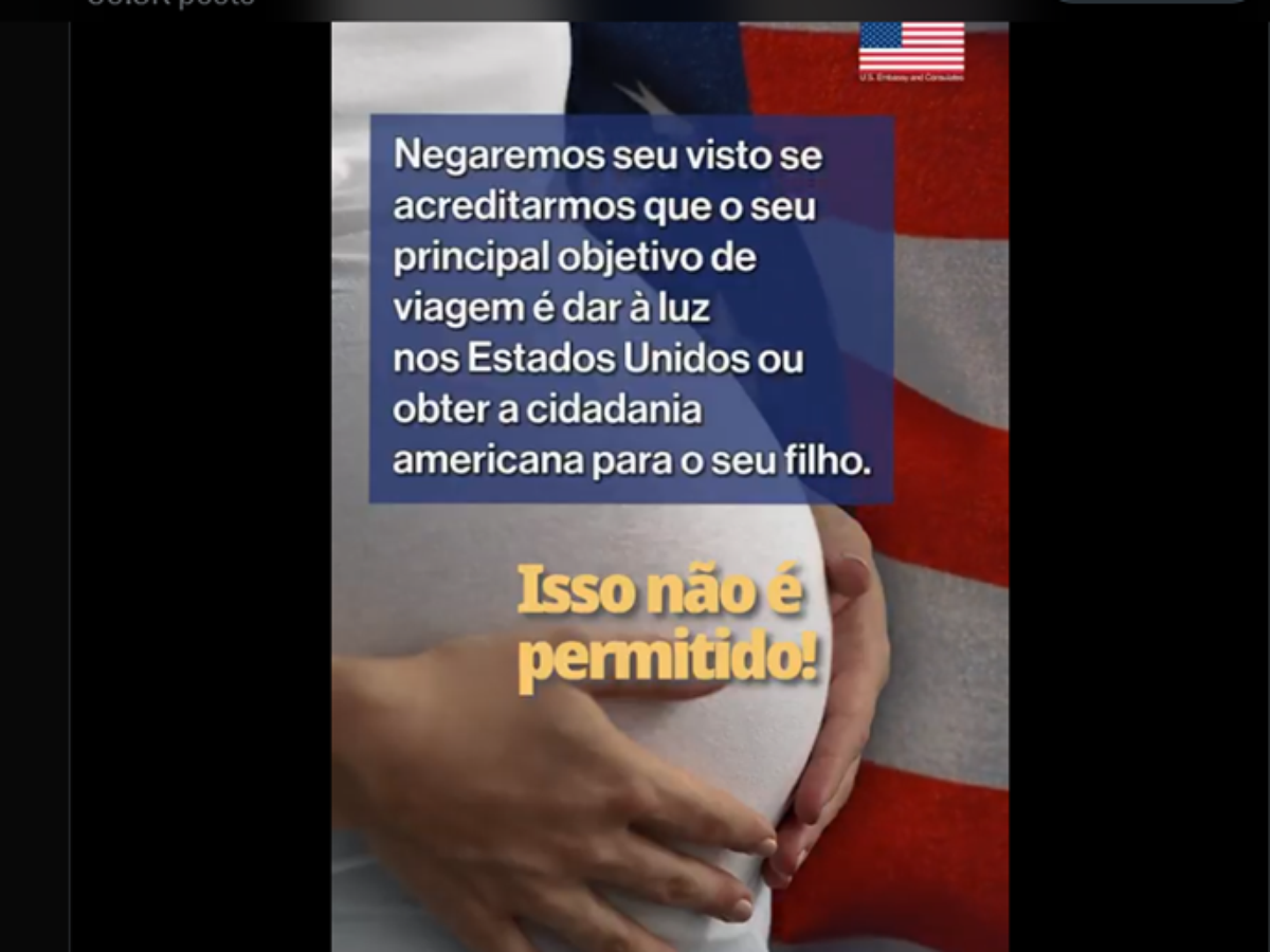A Embaixada dos Estados Unidos no Brasil publicou um vídeo alertando mulheres grávidas que pretendem viajar ao país apenas para dar à luz e garantir a cidadania americana aos filhos. Segundo o aviso, vistos serão negados caso essa intenção seja identificada.