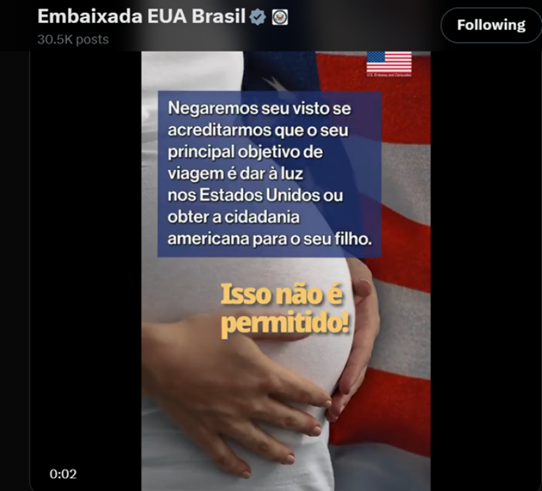 A Embaixada dos Estados Unidos no Brasil divulgou, em sua conta oficial na rede X (antigo Twitter), um vídeo com um recado direto às mulheres grávidas que pretendem viajar ao país com o objetivo de dar à luz e, assim, garantir a cidadania norte-americana para seus filhos.