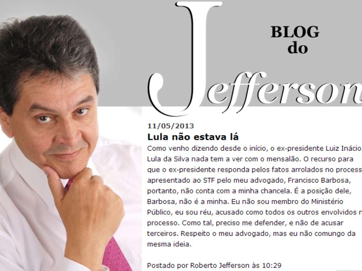 O presidente licenciado do PTB, Roberto Jefferson, postou em seu blog um texto no qual nega o envolvimento do ex-presidente Luiz Inácio Lula da Silva no esquema do mensalão, o qual ele foi apontado como delator e condenado a 7 anos e 14 dias por lavagem de dinheiro e corrupção passiva. O discurso de Jefferson confronta a tese de seu próprio advogado, Luiz Francisco Corrêa Barbosa, que pediu a apuração de suposto envolvimento do ex-presidente no esquema. Os embargos de declaração foram apresentados no dia 2 de maio ao Supremo Tribunal Federal (STF).