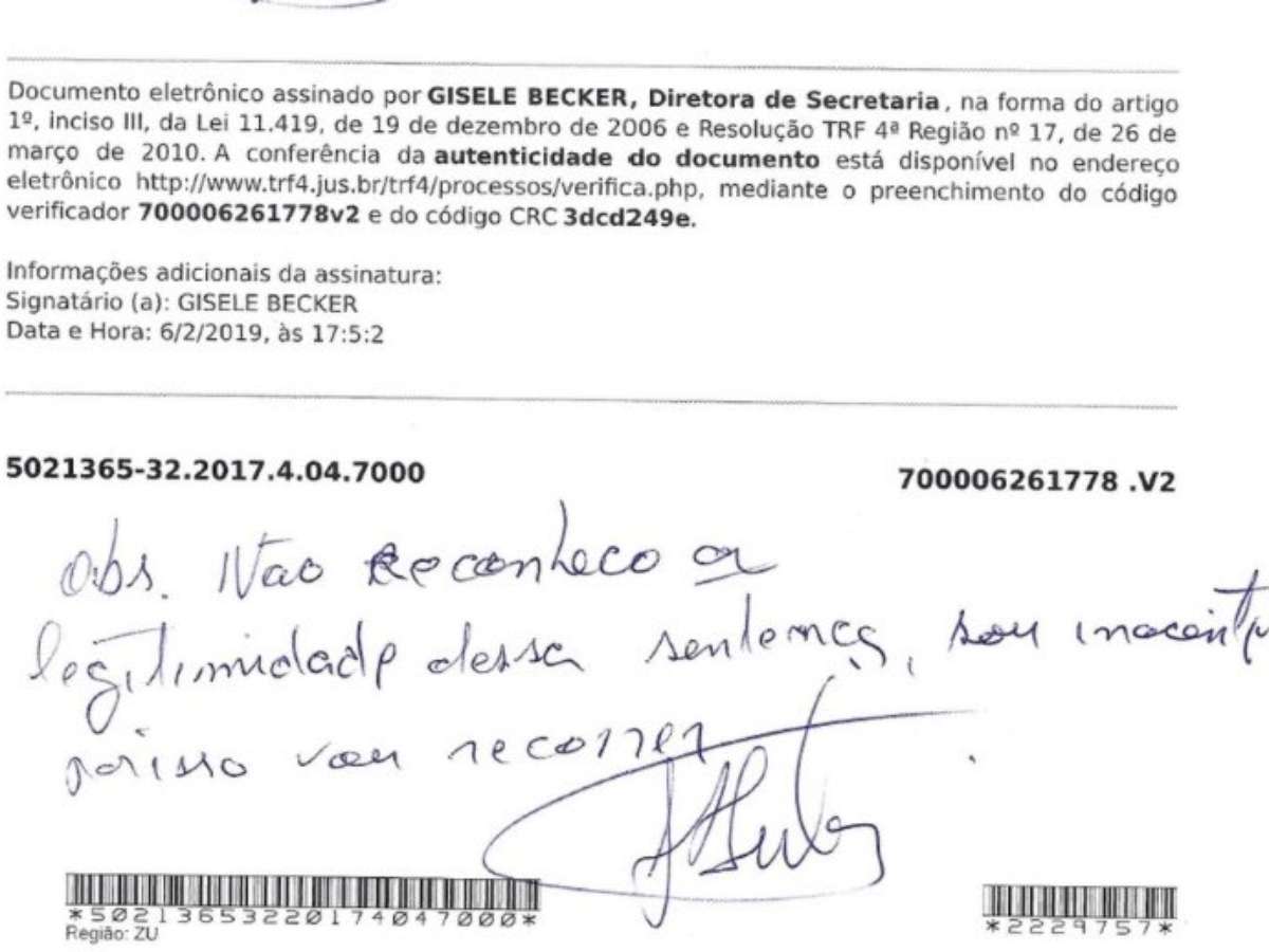 "Não reconheço a legitimidade dessa sentença, sou inocente, por isso vou recorrer", escreveu Lula ao assinar o documento. A publicação do Twitter diz que o ex-presidente recebeu "mais uma sentença política".