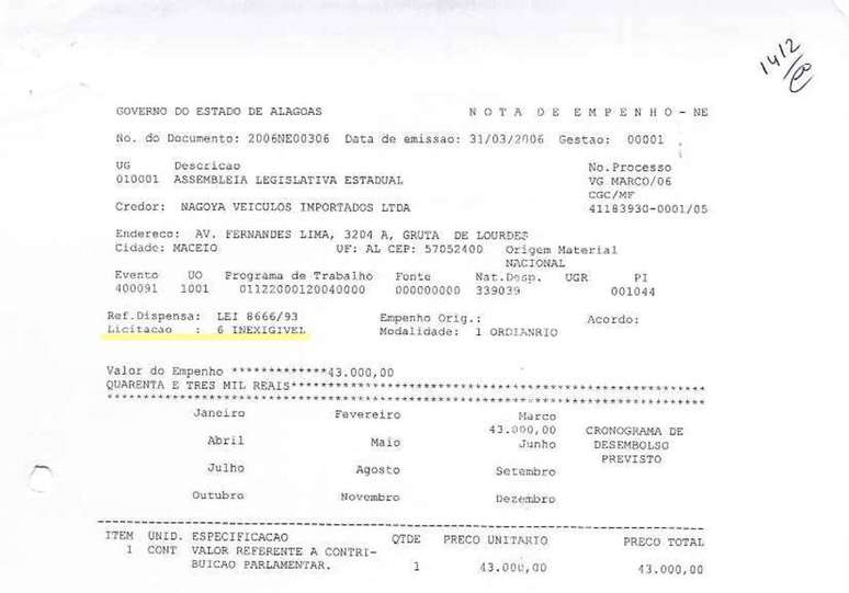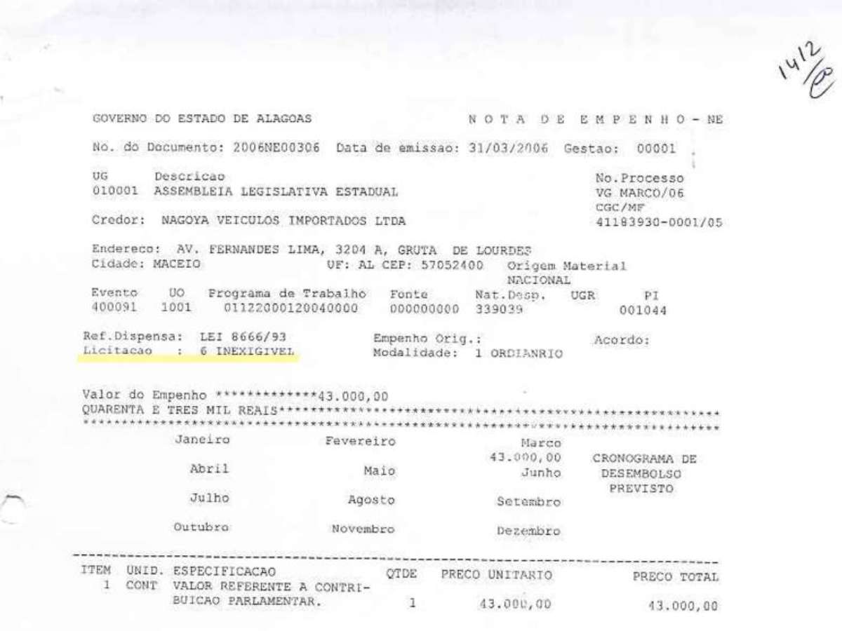 A nota de empenho com o nome de Arthur Cesar Pereira de Lira, para a concessionária Nagoya Veículos Importados LTDA, é datada de 31 de março de 2006 e registra que não houve licitação para a realização do pagamento. Também é dito que o valor é referente a uma "contribuição parlamentar". O então deputado estadual aparece no documento como "ordenador da despesa". Quatro dias depois, o extrato da conta bancária da Nagoya Veículos exibiu o recebimento de R$ 42.988,00.