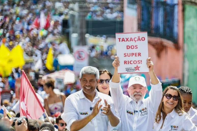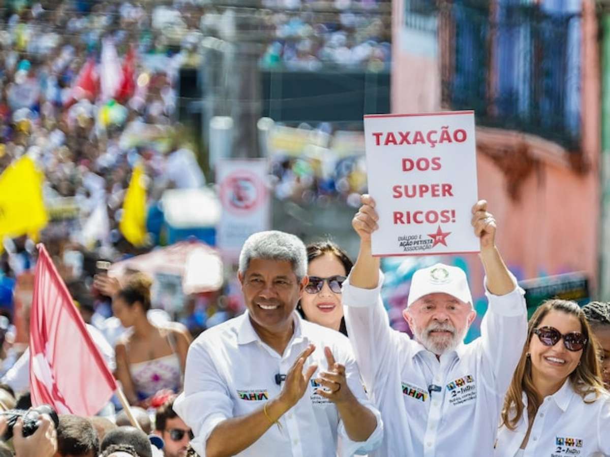O presidente Luiz Inácio Lula da Silva (PT) exibiu cartaz que pedia a "taxação dos super ricos" durante evento que celebrou a independência da Bahia nesta quarta-feira, 2. O petista compartilhou foto do ato em suas redes sociais, na imagem, ele aparece ao lado da primeira-dama, Rosângela Lula da Silva, a Janja, e do governador da Bahia, Jerônimo Rodrigues (PT).