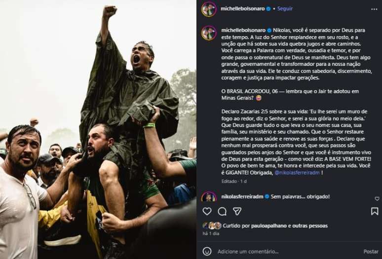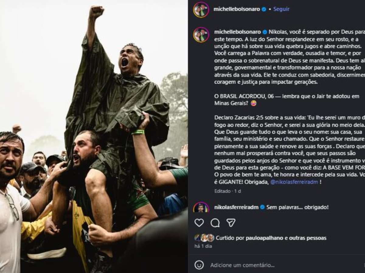 A ex-primeira-dama Michelle Bolsonaro (PL) se referiu ao deputado federal Nikolas Ferreira (PL-MG) como "filho 06" do ex-presidente Jair Bolsonaro (PL) em uma postagem em rede social. A publicação foi compartilhada nesta segunda-feira, 26, após a mobilização política conduzida pelo parlamentar mineiro, que percorreu cerca de 240 quilômetros de Paracatu (MG) até Brasília.