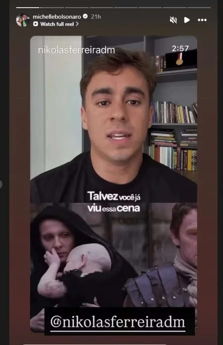 Após uma briga nas redes sociais entre o deputado federal Nikolas Ferreira (PL-MG) e o ex-deputado Eduardo Bolsonaro (PL-SP), a ex-primeira-dama Michelle Bolsonaro (PL) divulgou um vídeo publicado pelo parlamentar mineiro. Neste sábado, 4, Michelle republicou em seu perfil no Instagram um comentário de Nikolas sobre uma cena do filme A Paixão de Cristo, dirigido por Mel Gibson.