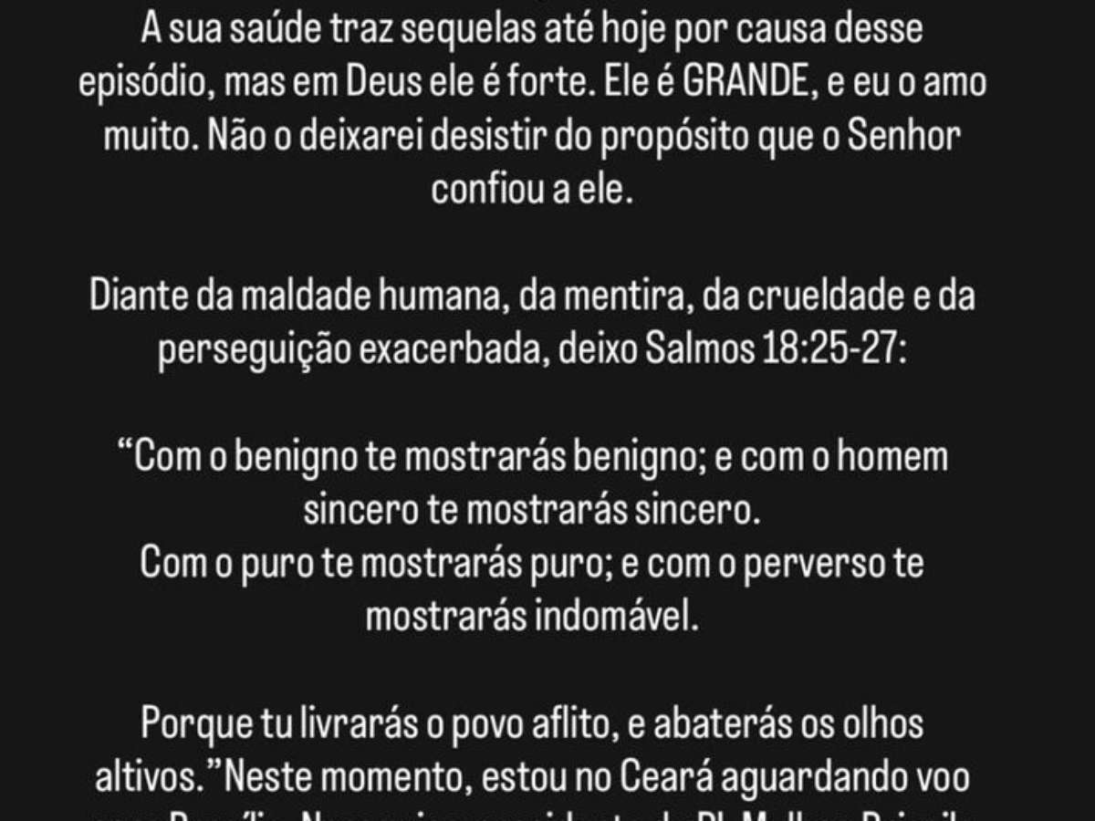 "A sua saúde traz sequelas até hoje por causa desse episódio, mas em Deus ele é forte. Ele é GRANDE, e eu o amo muito. Não o deixarei desistir do propósito que o Senhor confiou a ele", complementou.