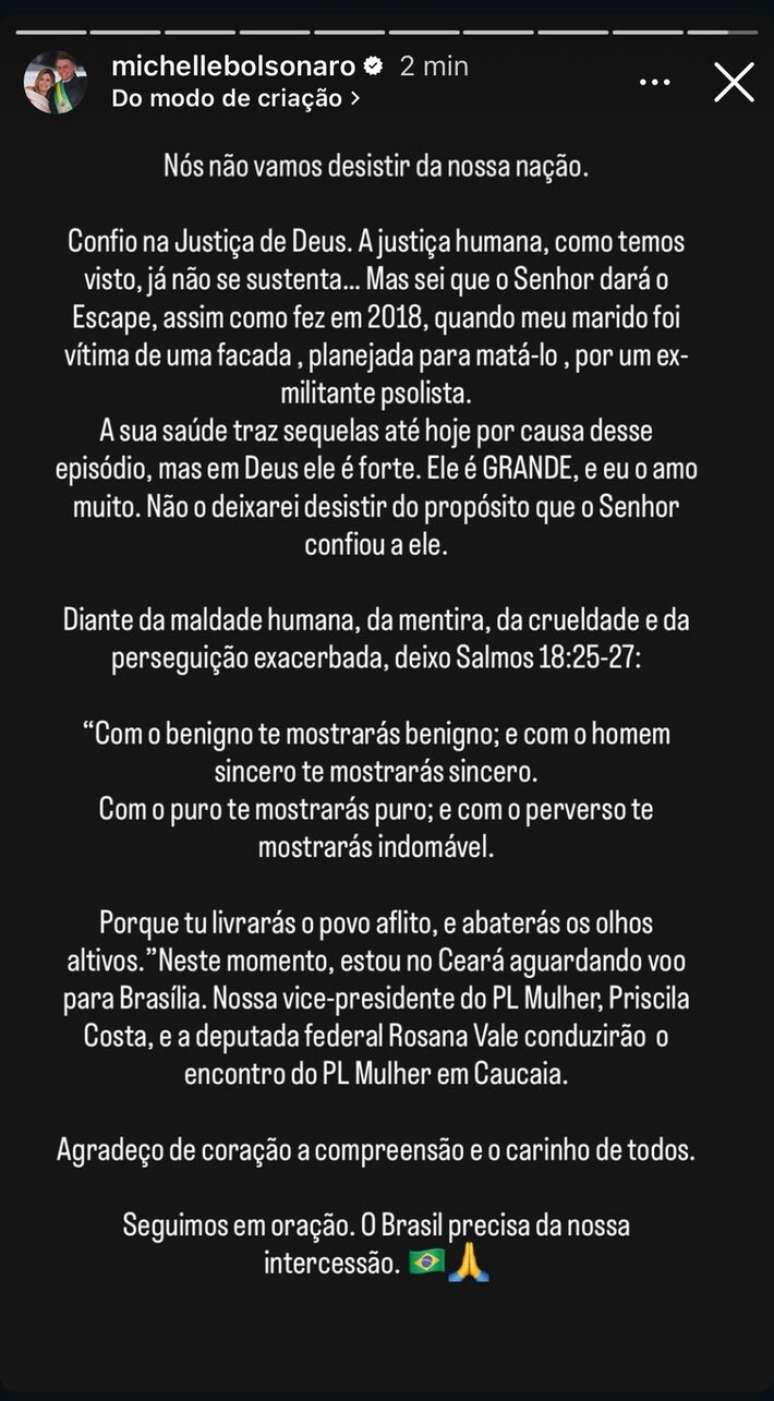 Na mesma mensagem, compartilhada nos stories, Michelle citou mensagem bíblica e utilizou tom religioso para se referir à prisão de Bolsonaro.