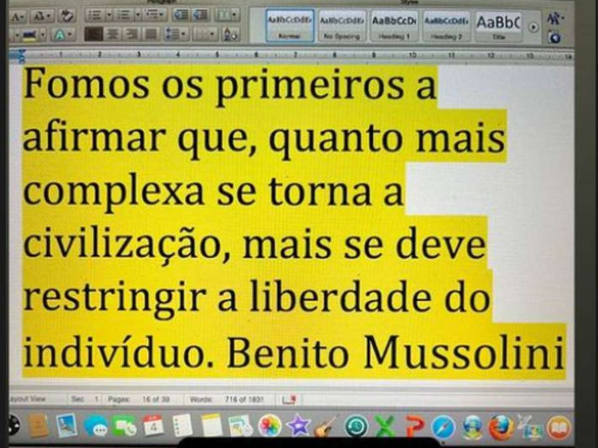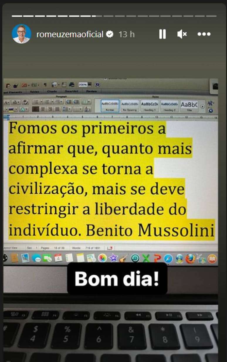 No último sábado, 1.º, um dia após o julgamento de Bolsonaro no TSE, Zema publicou uma frase atribuída a Benito Mussolini, ditador italiano morto em abril de 1945. "Fomos os primeiros a afirmar que, quanto mais complexa se torna a civilização, mais se deve restringir a liberdade do indivíduo", diz o texto postado em seu story no Instagram ao lado da legenda de "bom dia".