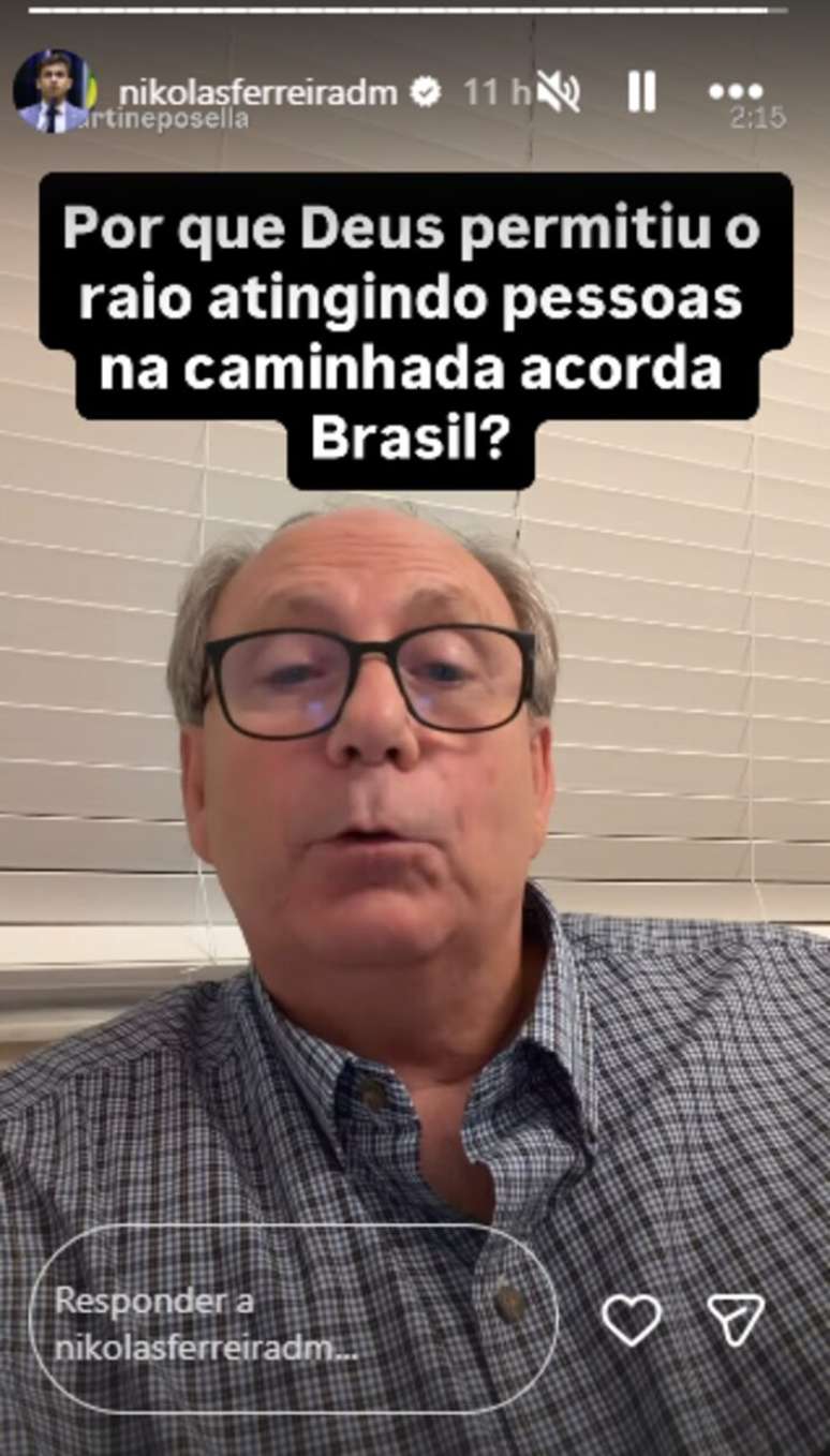 O deputado federal Nikolas Ferreira (PL-MG) divulgou neste domingo, 25, um vídeo em que o coach religioso Lamartine Posella atribui a uma "vontade divina" o raio que atingiu participantes da "Caminhada pela Liberdade", manifestação organizada pelo parlamentar, em Brasília.