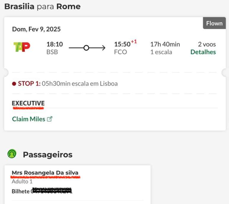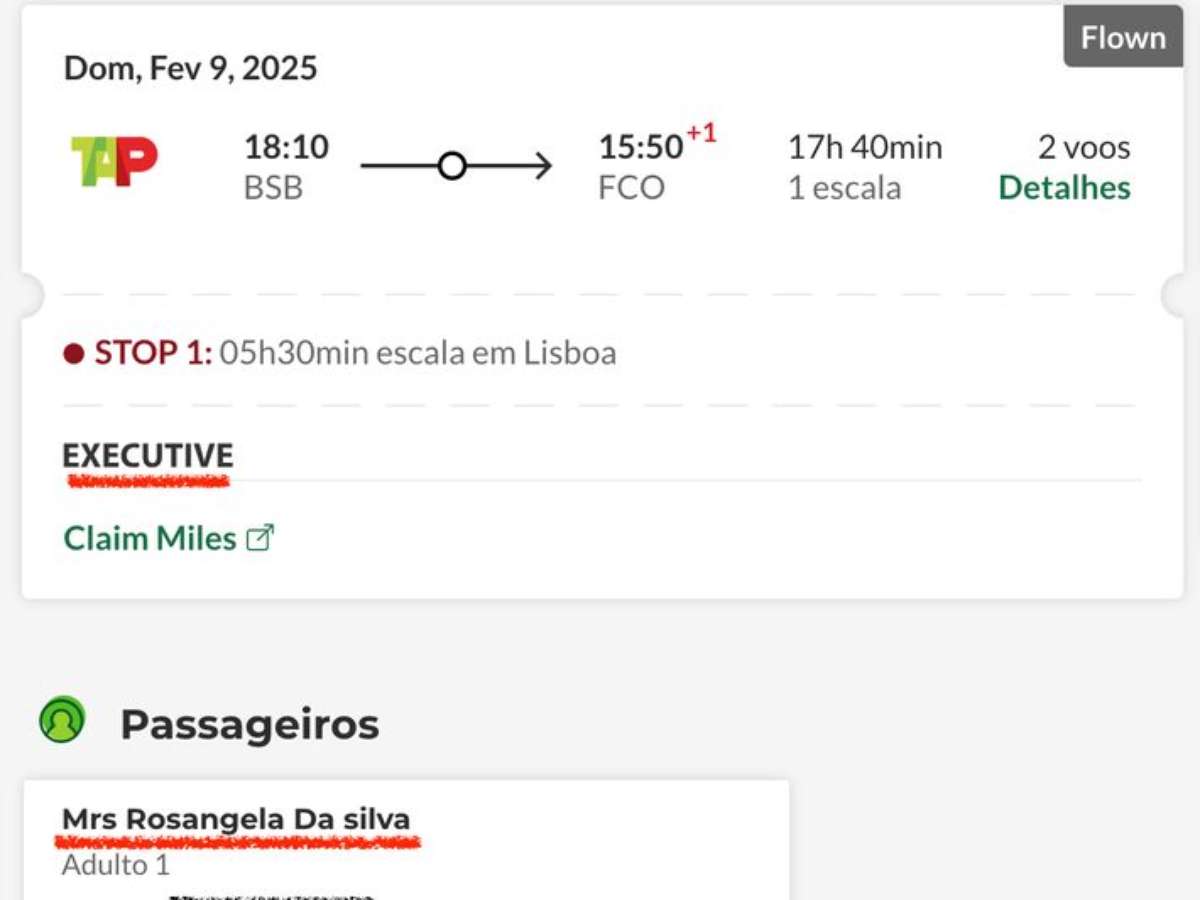 Na volta, Janja pegou um voo direto de 12h e 4 minutos, de Fiumicino para o aeroporto internacional de Guarulhos (SP). A primeira-dama viajou no assento 10 L, na janela, na classe premium business, equivalente à executiva.