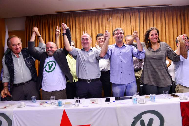Da direita para a esquerda, o ex-ministro do Meio Ambiente, Carlos Minc (PV), Jandira Feghali (PC do B), o pré-candidato ao governo do Estado pelo PT, Lindbergh Farias, o ambientalista Roberto Rocco (PV) no evento que oficializou o apoio do PV à candidatura de Lindbergh