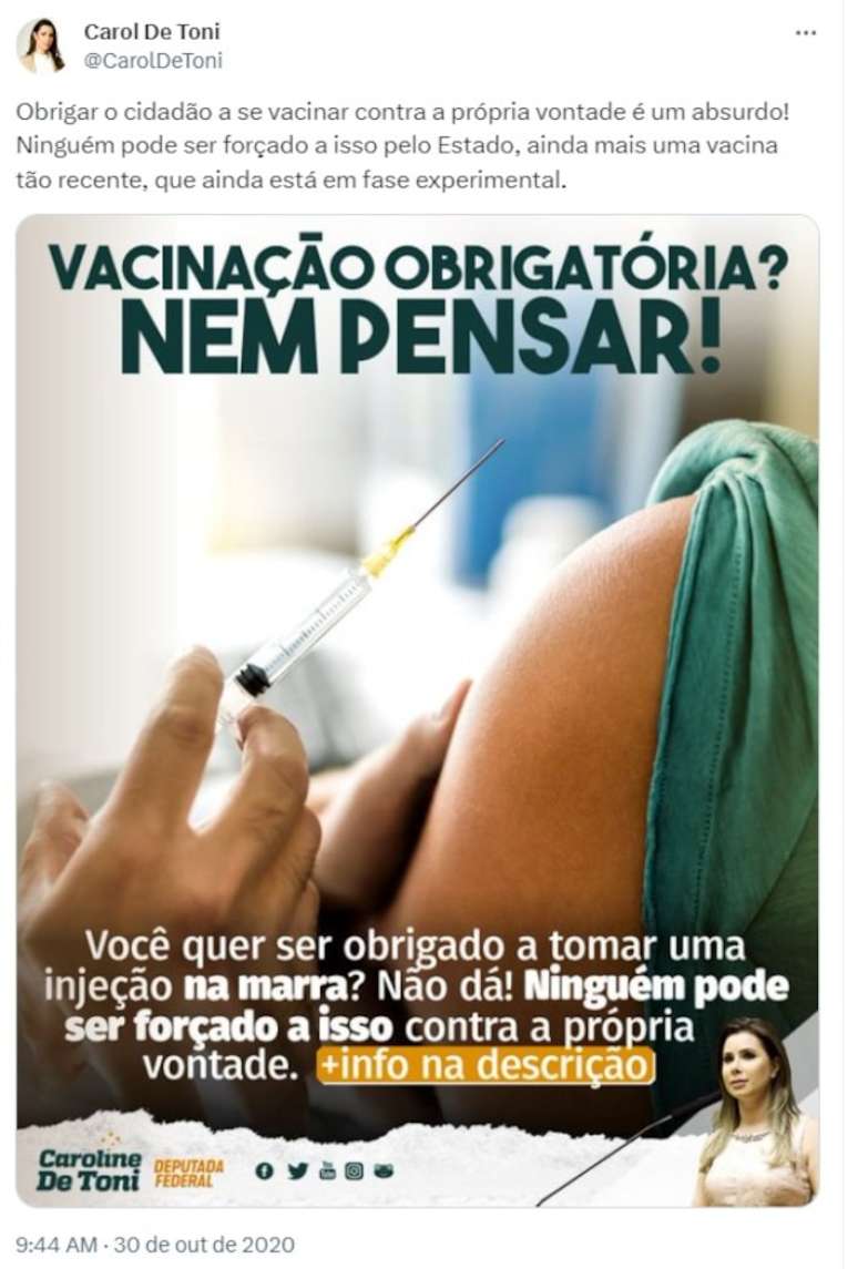 O questionamento sobre a eficácia de vacinas foi difundido por Bolsonaro e seus aliados no governo anterior. Em diversas ocasiões, o ex-presidente questionou a utilidade dos imunizantes contra a covid-19. Em outubro de 2020, Caroline afirmou que "obrigar o cidadão a se vacinar é um absurdo".