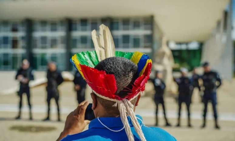 "Não é para que o Congresso crie leis que venham nos matar, que venham trazer tragédia para o nosso território com minério e agronegócio, vamos parar com isso", discursou Alberto Terena, coordenador executivo da Apib pelo Conselho do Povo Terena, de Mato Grosso do Sul.