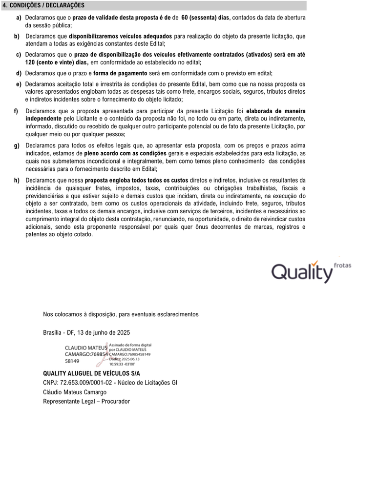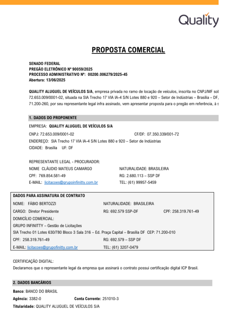 “O contrato nº116/2025 disponibiliza 79 veículos e uma minivan adaptada (para uso da senadora Mara Gabrilli), incluindo manutenção preventiva e corretiva dos veículos, lavagem automotiva, seguros, taxas e impostos, durante 60 (sessenta) meses consecutivos, contemplando um total de 80 (oitenta) veículos. A frota é fornecida pela empresa Quality Aluguel de Veículos S/A.