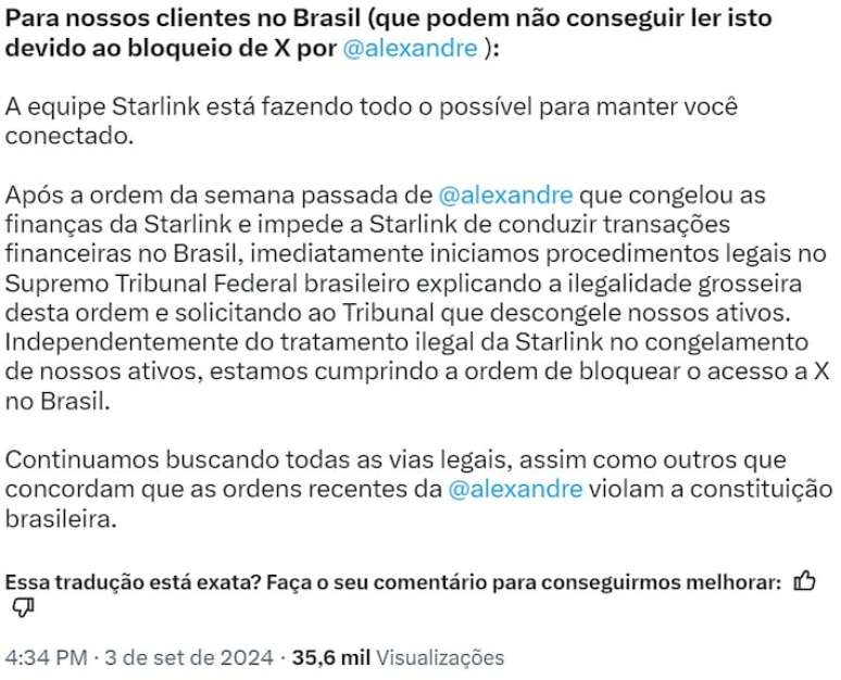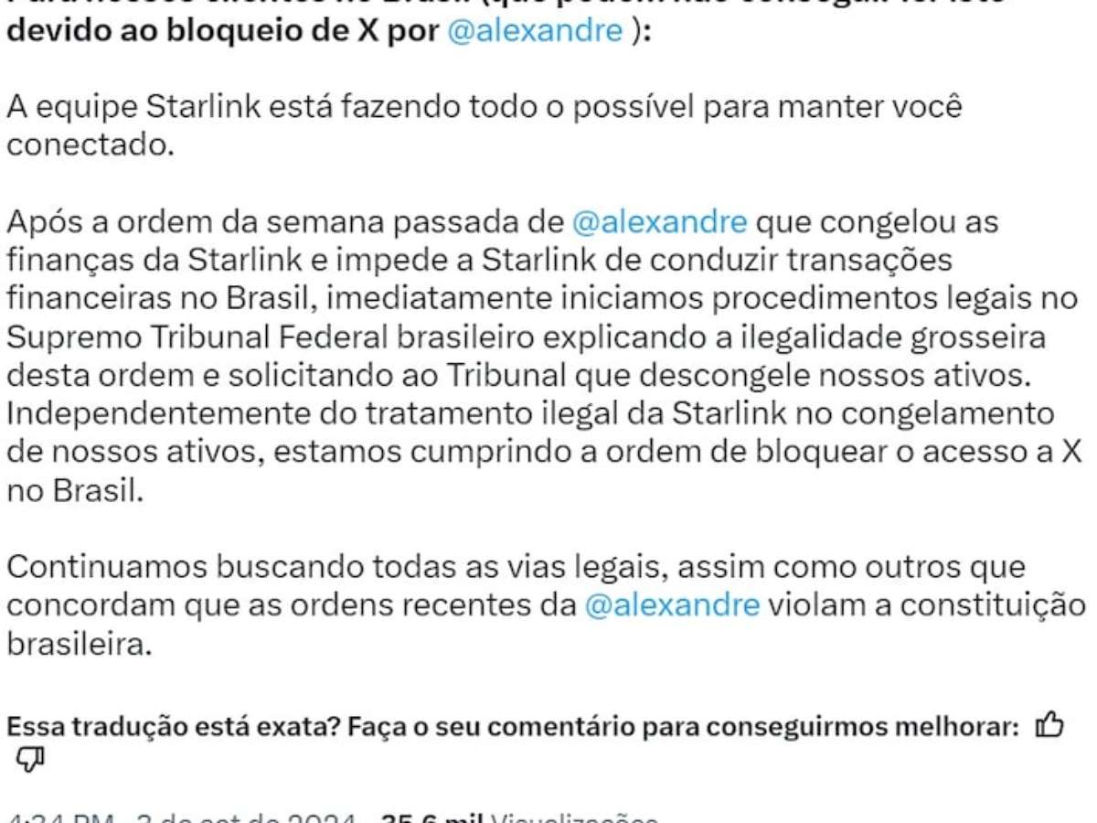 "Após a ordem da semana passada de Alexandre de Moraes que congelou as finanças da Starlink e impede a Starlink de conduzir transações financeiras no Brasil, imediatamente iniciamos procedimentos legais no Supremo Tribunal Federal brasileiro explicando a ilegalidade grosseira desta ordem e solicitando ao Tribunal que descongele nossos ativos. Independentemente do tratamento ilegal da Starlink no congelamento de nossos ativos, estamos cumprindo a ordem de bloquear o acesso a X no Brasil", afirmou.