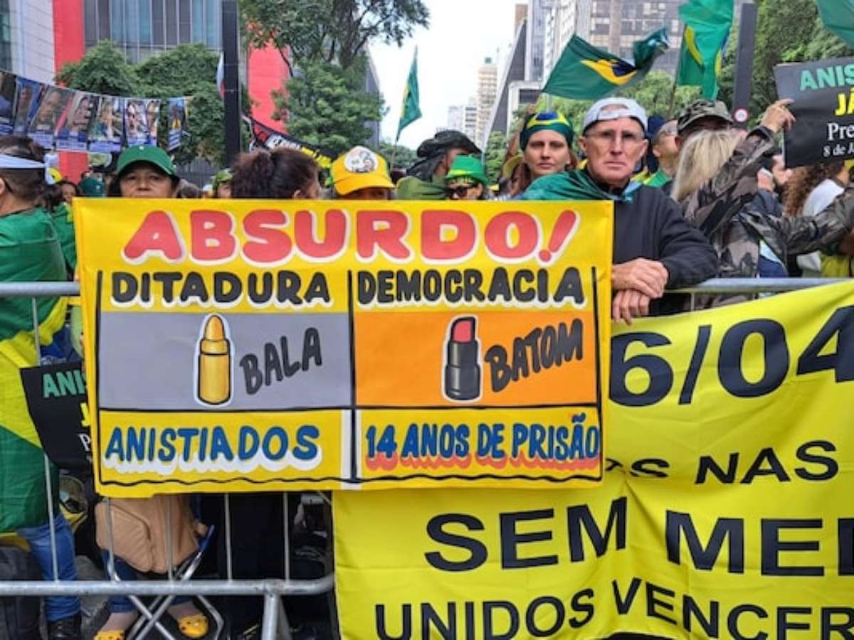 Bolsonaristas mostram que o principal mote do protesto é pressionar pela aprovação do projeto de lei que anistia os condenados e presos pelo ato golpista do dia 8 de janeiro de 2023. Cartazes com o rosto de alguns dos detidos foram pendurados pela avenida.