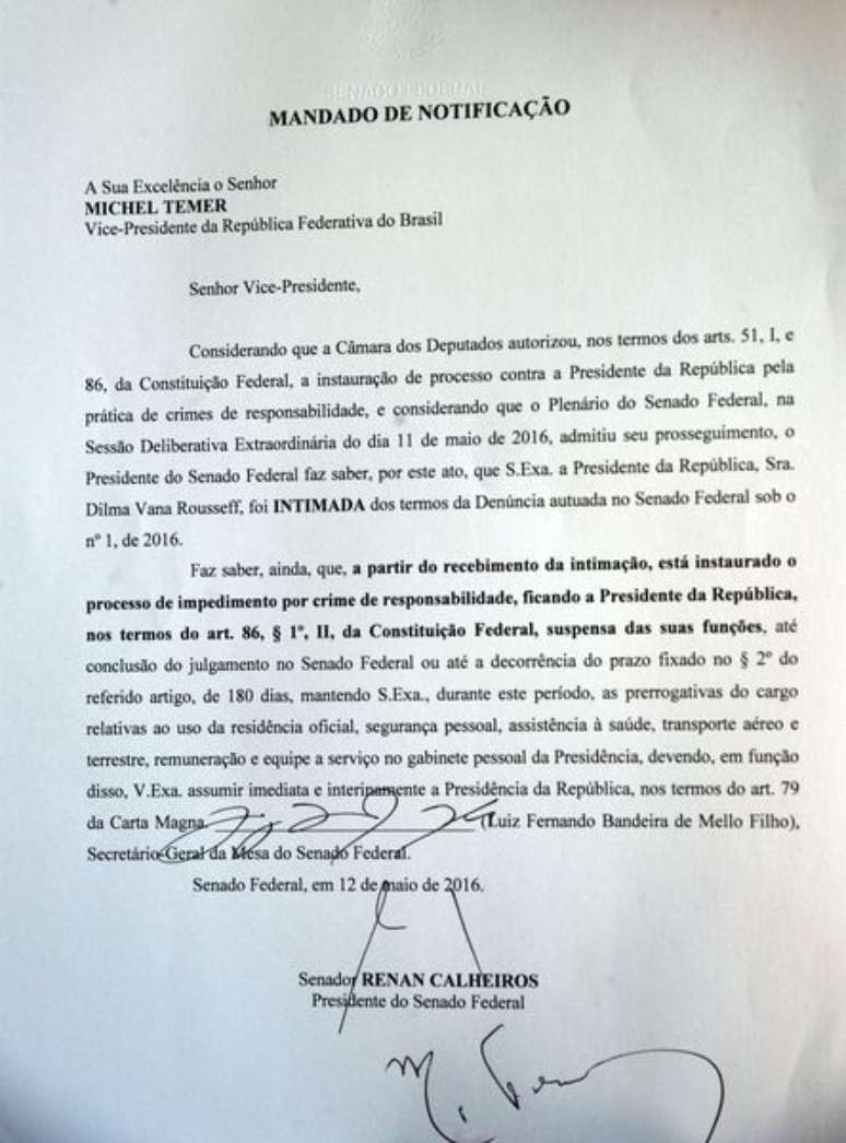 A notificação, assinada pelo presidente do Senado, Renan Calheiros, e entregue pelo primeiro secretário da Casa, Vicentinho Alves (PR-TO), torna Temer chefe do governo por até 180 dias, prazo máximo para o processo do julgamento de Dilma.