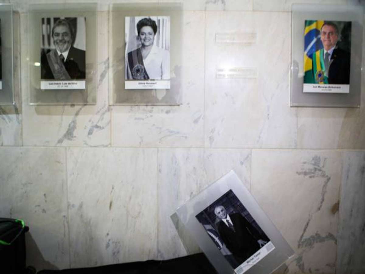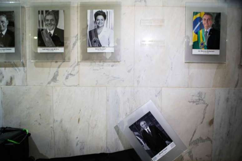 A foto, em preto e branco, está na Galeria dos Presidentes, no saguão principal do Planalto. Naquele espaço, Temer fica entre Dilma Rousseff - que sofreu impeachment em 2016 e foi substituída por ele, à época vice - e Jair Bolsonaro. Dilma é a única mulher da galeria onde só Bolsonaro tem a fisionomia colorida porque ainda está no exercício do mandato.