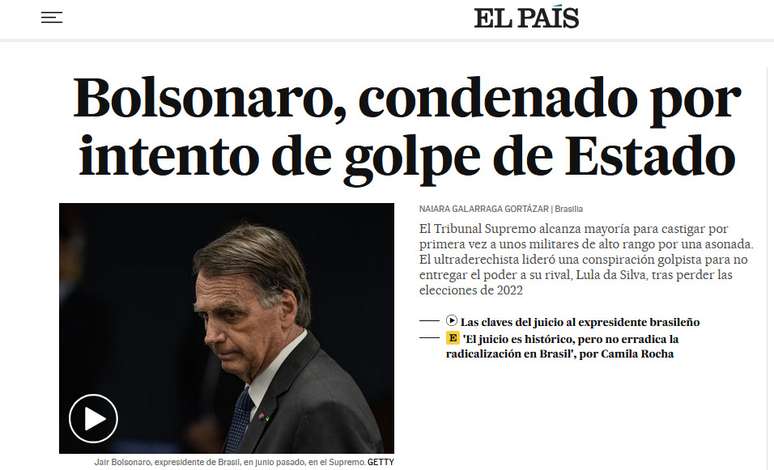 No jornal El País a condenação por tentativa de golpe de Estado de Jair Bolsonaro virou manchete. O jornal considerou o julgamento como o "mais politicamente relevante do Brasil nos últimos anos” e deu ênfase ao fato desta ser a primeira vez que a Suprema Corte punirá militares de alto escalão por ataque à democracia. “O ultra-direitista liderou um plano de golpe para não entregar o poder ao seu rival, Lula da Silva, depois de perder as eleições de 2022”, complementaram.