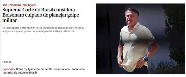 "Bolsonaro é considerado culpado de planejar golpe", é assim que o assunto é chamado no topo do portal da BBC. O jornal diz que os juízes "descobriram" que a mobilização golpista de Bolsonaro culminou nos atos antidemocráticos de 8 de janeiro. As críticas de aliados do ex-presidente também foram citadas. "Embora Bolsonaro já esteja impedido de concorrer a cargos públicos até 2030 por alegar falsamente que o sistema de votação do Brasil era vulnerável a fraudes, ele declarou sua intenção de lutar contra essa proibição para poder concorrer a um segundo mandato em 2026", escreveram.