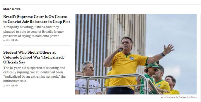No The New York Times o assunto não teve tanto destaque no portal, mas o veículo publicou uma matéria com o título "Suprema Corte do Brasil está em curso para condenar Bolsonaro em conspiração de golpe" e destacou: “Isso marca um momento crucial em um julgamento de meses que testou a maior democracia da América Latina, dominou as manchetes em casa e no exterior e lançou dúvidas sobre o futuro legal e político da figura de direita mais poderosa do Brasil”.