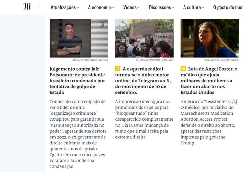 O Le Monde foi outro veículo que destacou o assunto nesta quinta-feira. O jornal ressaltou que a pena do ex-presidente Jair Bolsonaro pode exceder 40 anos de prisão e que o julgamento "dividiu fortemente uma opinião ultrapolarizada", citando uma "crise sem precedentes entre a maior potência da América Lartina e os EUA".