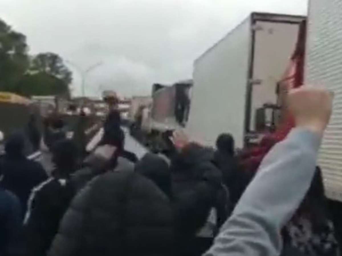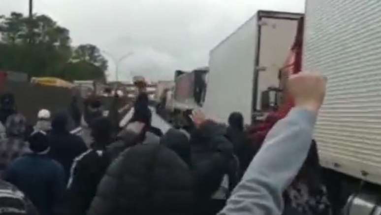 Outro vídeo que circula nas redes sociais mostra torcedores do Corinthians caminhando entre caminhões na Via Dutra.