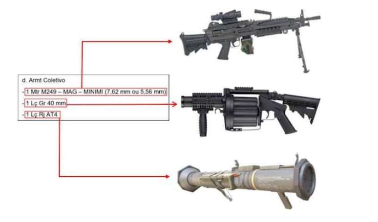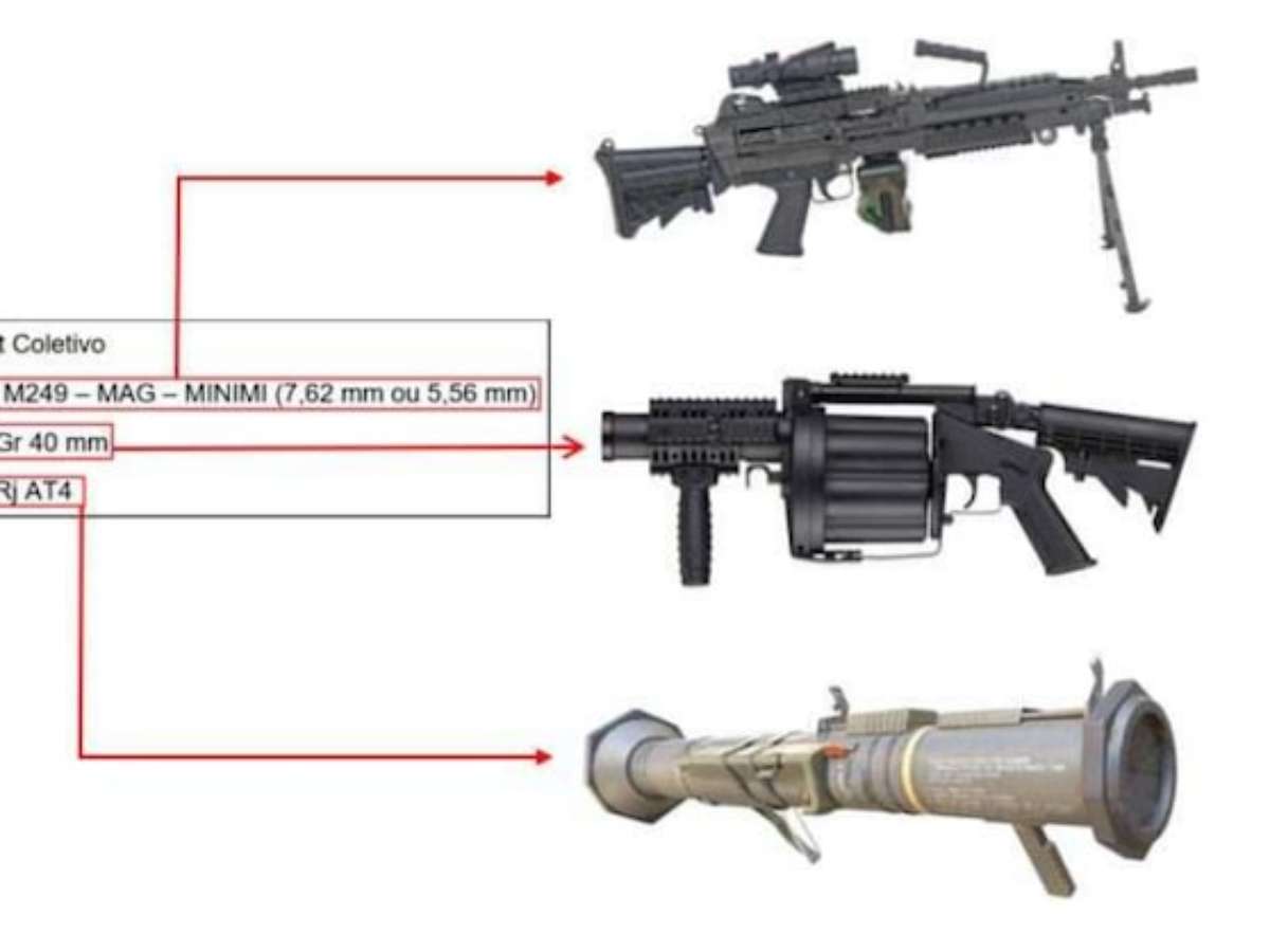 Segundo o relatório, o arsenal previsto contava com quatro pistolas 9mm ou .40 e quatro fuzis 5,56mm, 7,62mm ou .338, uma munição de alta precisão usada em combates de longa distância. Essas armas são amplamente utilizadas por forças de segurança e militares pela precisão e capacidade de neutralizar alvos em diferentes situações táticas.