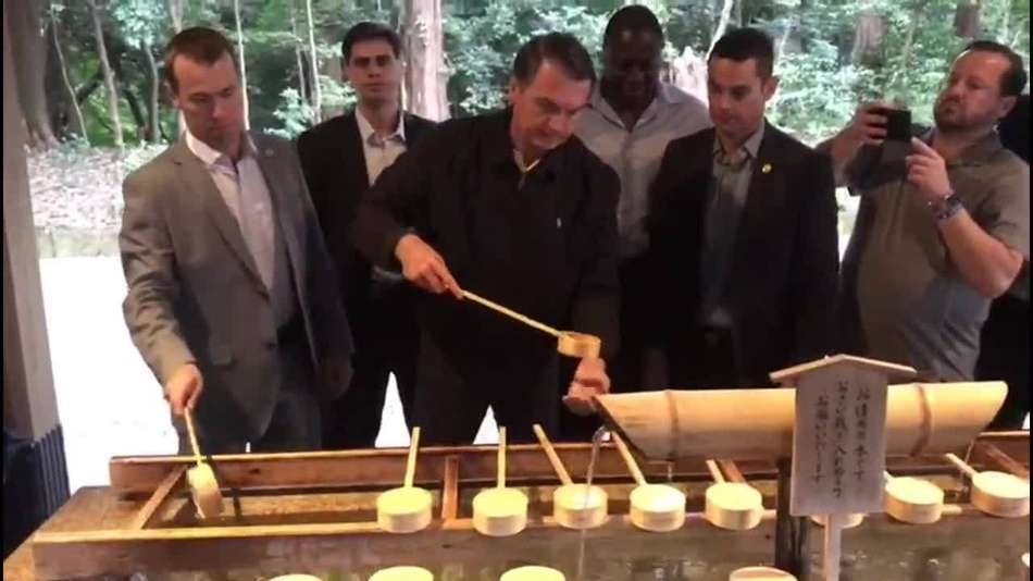 Durante um ritual usado para purificação, no bairro Shinbuya, em Tóquio, o presidente disse que "está precisando" deste tipo de limpeza. Ele fez comentário ao ouvir a explicação de que o procedimento de lavar das mãos com água corrente serve para combater o mal e impurezas. Imagens e reportagem - Julia Lindner