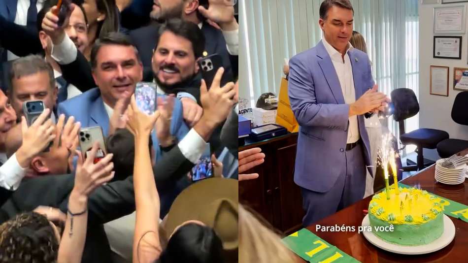 Flávio Bolsonaro é parabenizado por aniversário em meio à festa por derrubada do veto ao PL da Dosimetria. O senador (PL-RJ) e pré-candidato à presidência recebeu o carinho de aliados no plenário da Câmara dos Deputados nesta quinta-feira, 30. O festejo ocorreu enquanto os parlamentares comemoravam o resultado da votação que derrubou o veto de Lula ao projeto que reduz penas dos envolvidos no 8/1. Mais cedo, Flávio Bolsonaro postou um vídeo onde assoprava velinhas em um bolo verde e amarelo e dizia que a data de ontem foi histórica, referindo-se à rejeição de Messias. Reprodução/flaviobolsonaro/Instagram Reprodução/davimorgadooficial/Instagram
