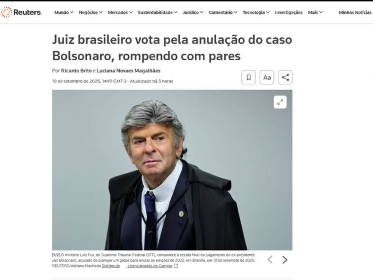 O voto do ministro Luiz Fux, do Supremo Tribunal Federal (STF), repercutiu na imprensa internacional, nesta quarta-feira, 10. Fux foi o terceiro a se manifestar no julgamento que analisa a responsabilidade do ex-presidente Jair Bolsonaro e de sete militares acusados de envolvimento em uma tentativa de golpe de Estado.