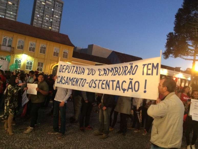 Um grupo de aproximadamente 100 pessoas realiza um protesto na noite dessa sexta-feira (14) nas proximidades do Palácio Garibaldi, no centro de Curitiba, onde mais tarde acontece o casamento da deputada estadual Maria Victória (PP). Membro da base aliada ao governador Beto Richa (PSDB), a parlamentar é filha da vice-governadora do Paraná, Cida Borghetti (PP), e do ministro da Saúde, Ricardo Barros (PP). Há algumas semanas, uma estrutura metálica foi colocada sob a fachada do edifício histórico. A intervenção foi autorizada pela Secretaria da Cultura, mas gerou polêmica na cidade, já que o prédio é tombado pelo Estado. Policiais militares acompanham a movimentação.