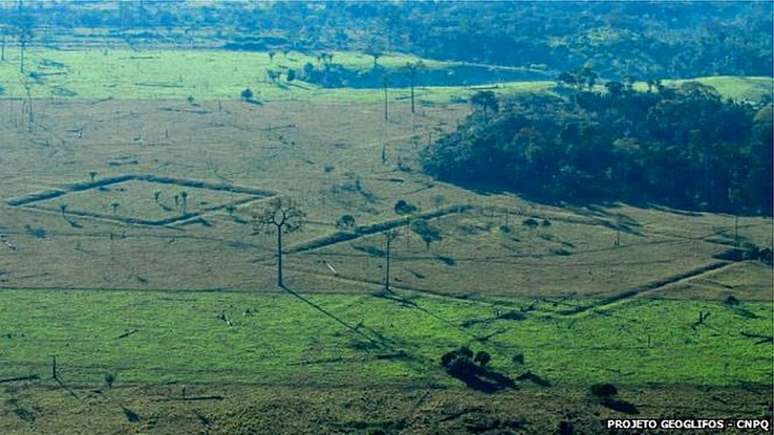Esses enormes desenhos geométricos na terra foram descobertos na Amazônia brasileira em 1977. Mas o desmatamento e estudos posteriores no terreno identificaram cerca de 500 somente no Acre, próximo à fronteira com a Bolívia.