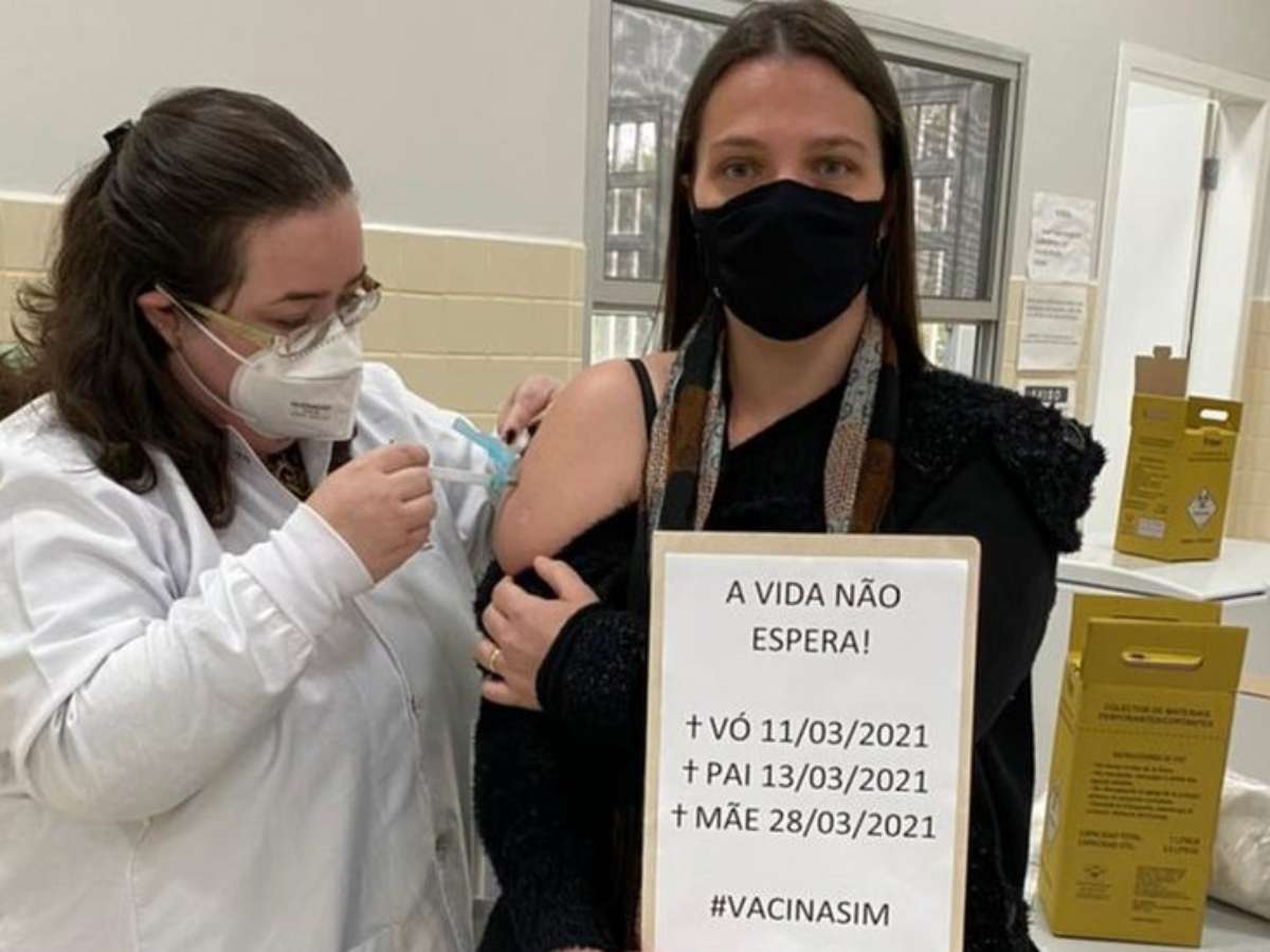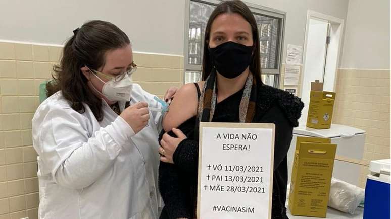 "A vida não espera!", diz o recado. Na folha, ela colocou as datas em que perdeu a avó, o pai e a mãe para a enfermidade causada pelo novo coronavírus. Ao fim, a tag #vacinasim.