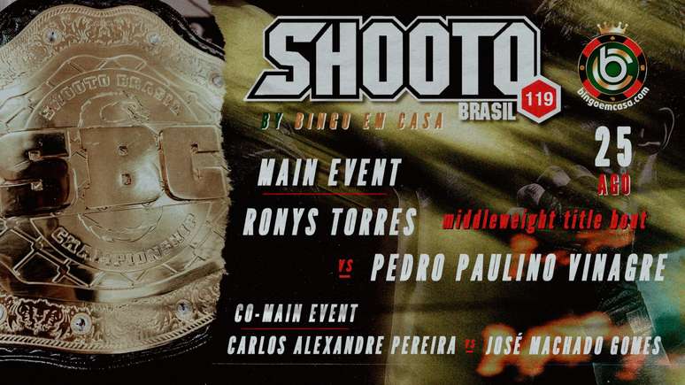 A luta principal coloca frente a frente Ronys Torres, 36 anos, e Pedro Paulino Vinagre, 39, pelo cinturão dos meio-médios Shooto Brasil anuncia as lutas principais de sua 119ª edição