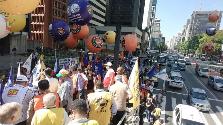 As centrais sindicais fazem nesta terça-feira (28) uma manifestação na avenida Paulista, em frente à sede do Banco Central, em São Paulo. O protesto tem como objetivo sensibilizar o Comitê de Política Monetária (Copom), que se reúne hoje para definir a nova taxa básica de juros, a Selic. Os manifestantes começaram a se concentrar às 10h30 e, no horário, não bloquevam a via.